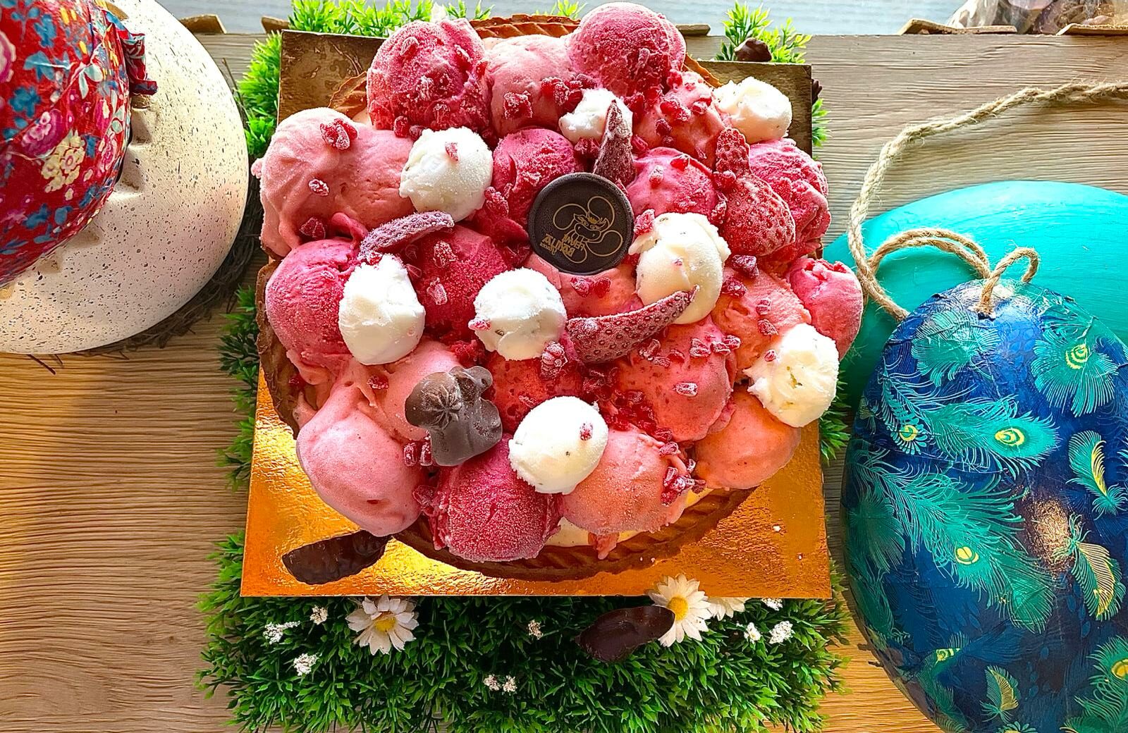 Une pâte sablé avec un fond de vanille surplomber de boules de glaces fraise, framboise et citron basilic.